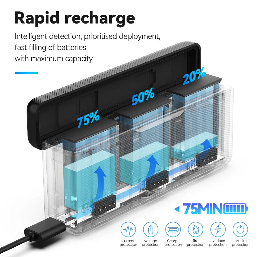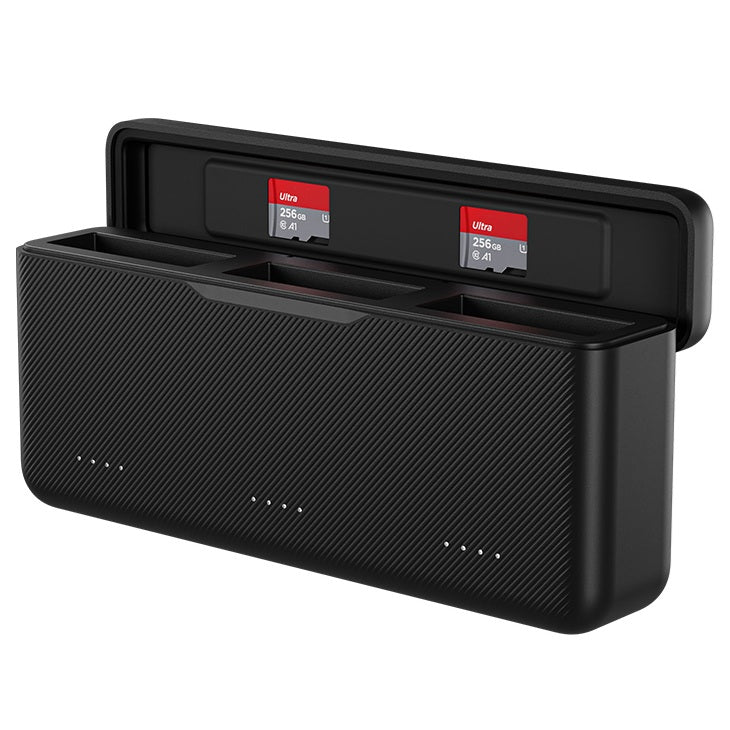 The 3 Channel Storage Battery Charger Box for Osmo 360 enables the simultaneous charging of three batteries and will automatically detect the number of batteries to adjust the charge current. Not only does it charge efficiently, but it also doubles as a storage container, accommodating up to four memory cards alongside batteries. Engineered with Type-C fast charging technology, it ensures rapid charging for your batteries.