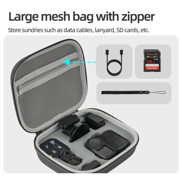 - Securely holds the camera and accessories such as adapters, lanyards, mounts, protective cover, & more.
