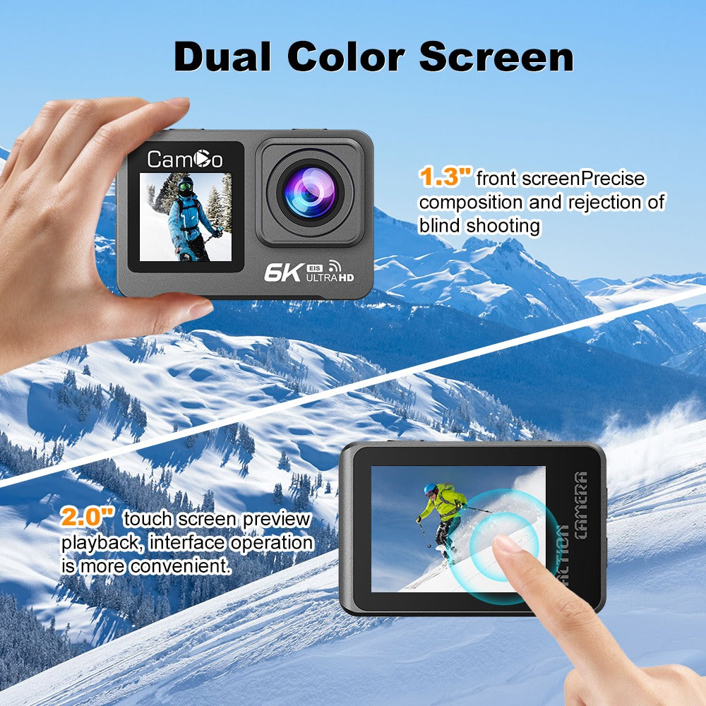 The CamGo 6K Ultra HD Snow Action Camera is a powerhouse of innovation, designed to capture life’s most thrilling moments in extreme conditions. Powered by the advanced MSTART8838 chipset, it delivers stunning 6K video resolution, ensuring every frame is rich in detail and clarity. Whether you're hitting the slopes or exploring rugged trails, this camera is built to perform in any weather condition. Equipped with 6 axis electronic image stabilization (EIS), the camera keeps your footage steady and smooth, even during fast paced action. Rugged, intelligent, and versatile, the CamGo 6K Ultra HD Snow Action Camera combines the best in action camera technology to Capture the Moment.