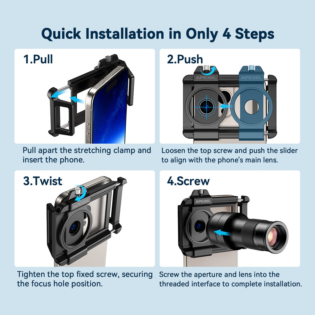 - 【Effortless Setup 】Attach and detach the lens in seconds with the user-friendly clamp system. No complicated adjustments needed – simply secure the bracket to your phone, attach the lens to the slider and start shooting!