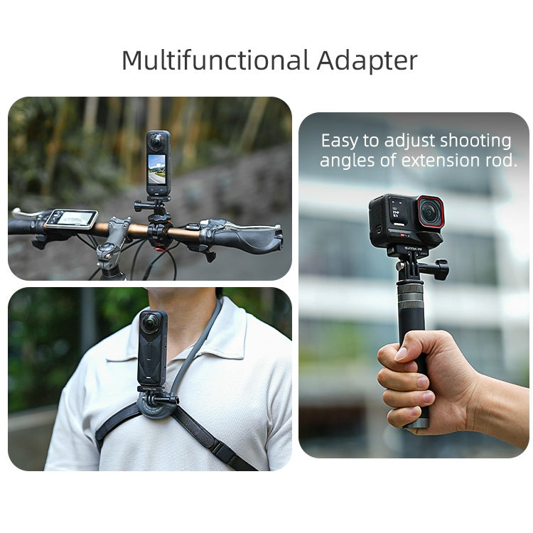The Magnetic Fork Adapter for Insta360 Ace / Ace Pro / Ace Pro 2 broadens the range of mounting possibilities. It facilitates the attachment of the camera to action camera accessories and mounts via the thumb screw connection. Additionally, the adapter features a 1/4" screw hole on the base, enabling compatibility with various universal accessories possessing a 1/4" screw thread.